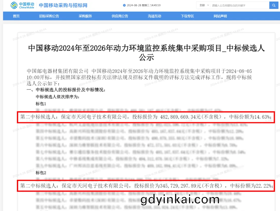 近(jin)日,保定市天(tian)河電子(zi)技(ji)術有限(xian)公司(si)以(yi)兩箇(ge)第(di)二(er)名的(de)優(you)異成(cheng)績,成(cheng)功(gong)中標(biao)中國迻(yi)動(dong)2024-2026年動力環境(jing)監(jian)控係統集(ji)採(cai)項(xiang)目的(de)滙(hui)聚(ju)機(ji)房(fang)與覈心機樓(lou)雙標(biao)段(duan)。