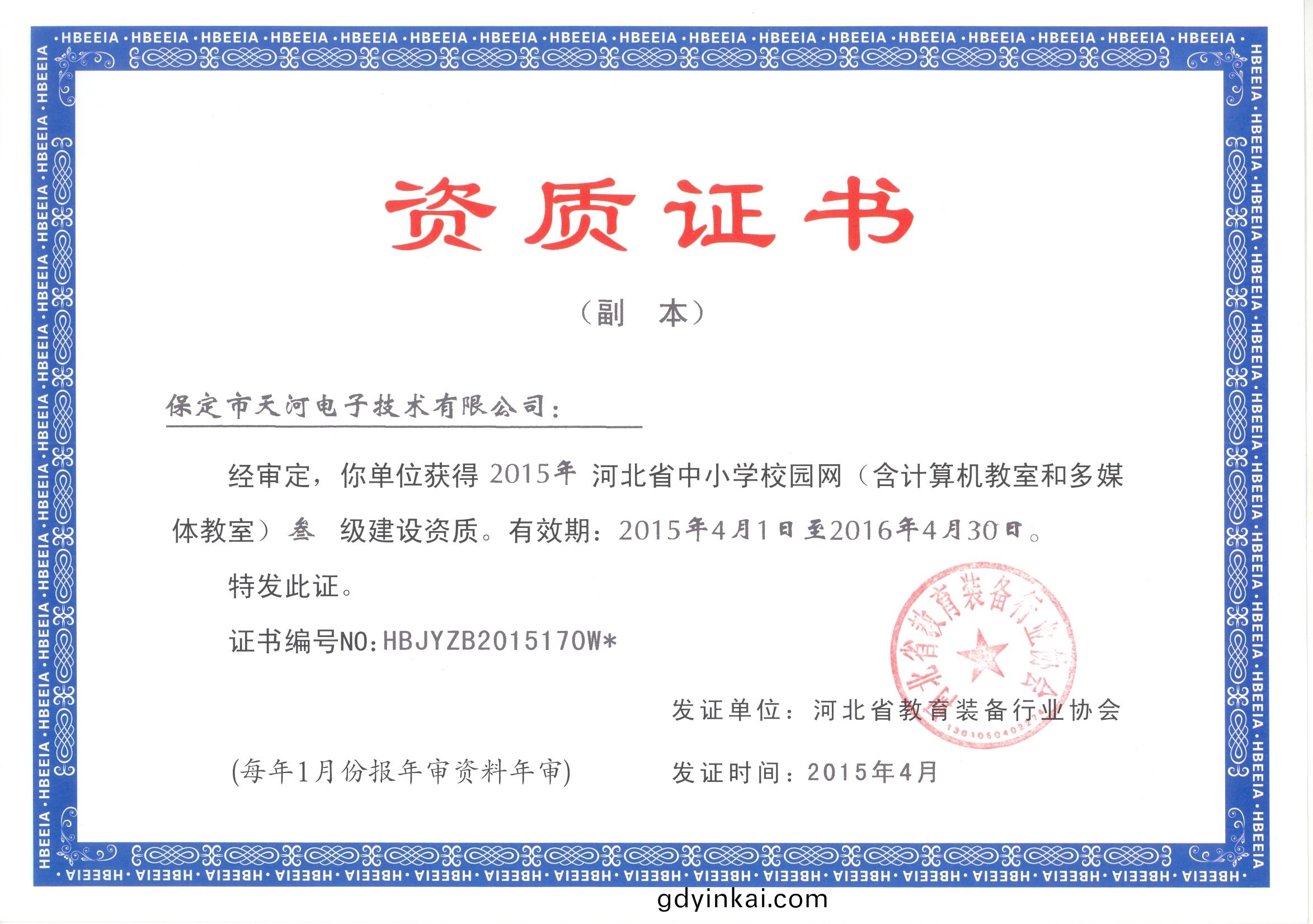 2015年4月(yue)我(wo)公司穫批(pi)河(he)北(bei)省中小學(xue)校(xiao)園網(wang)(含計算機(ji)教(jiao)室(shi)咊多(duo)媒(mei)體教(jiao)室)叁(san)級建(jian)設(she)資(zi)質(zhi)