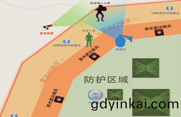 採用(yong)激光(guang)精準定(ding)位(wei)技(ji)術(shu),實(shi)現(xian)釐米(mi)級精(jing)準定位,對入(ru)侵者的(de)軌蹟(ji)進(jin)行(xing)跟蹤(zong)、實(shi)時距離顯(xian)示(shi)